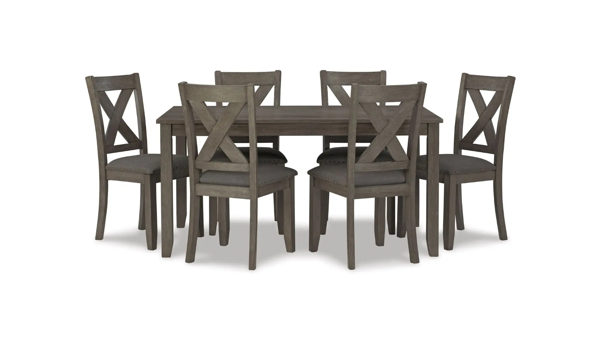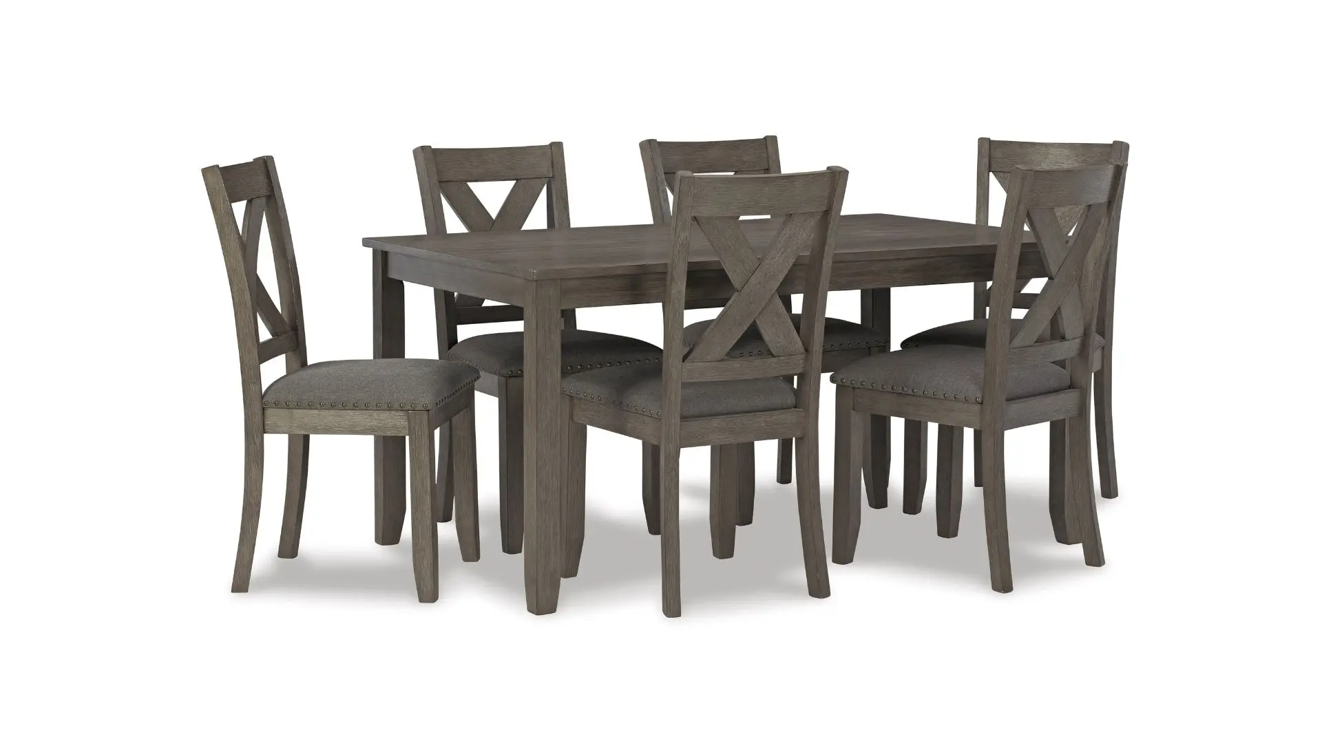 The Caitbrook counter height dining set makes a chic statement with its clean, contemporary design. Finished in a subtle gray wash, it radiates casual sophistication, while the soft, neutral upholstery of the cushioned seats ensures comfort for hours. Whether it’s family dinners, casual get-togethers, or lively game nights, this set blends style and function beautifully.(D388-425 RECT DRM TABLE SET 6PAX CAITBROOK (ASH))