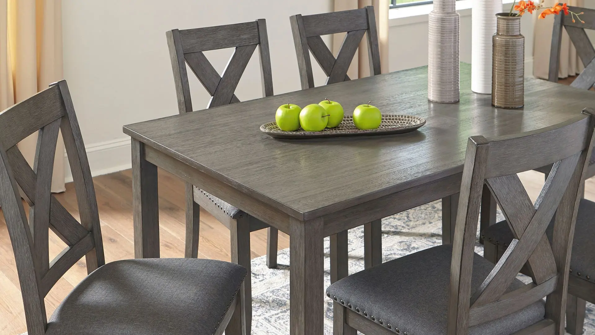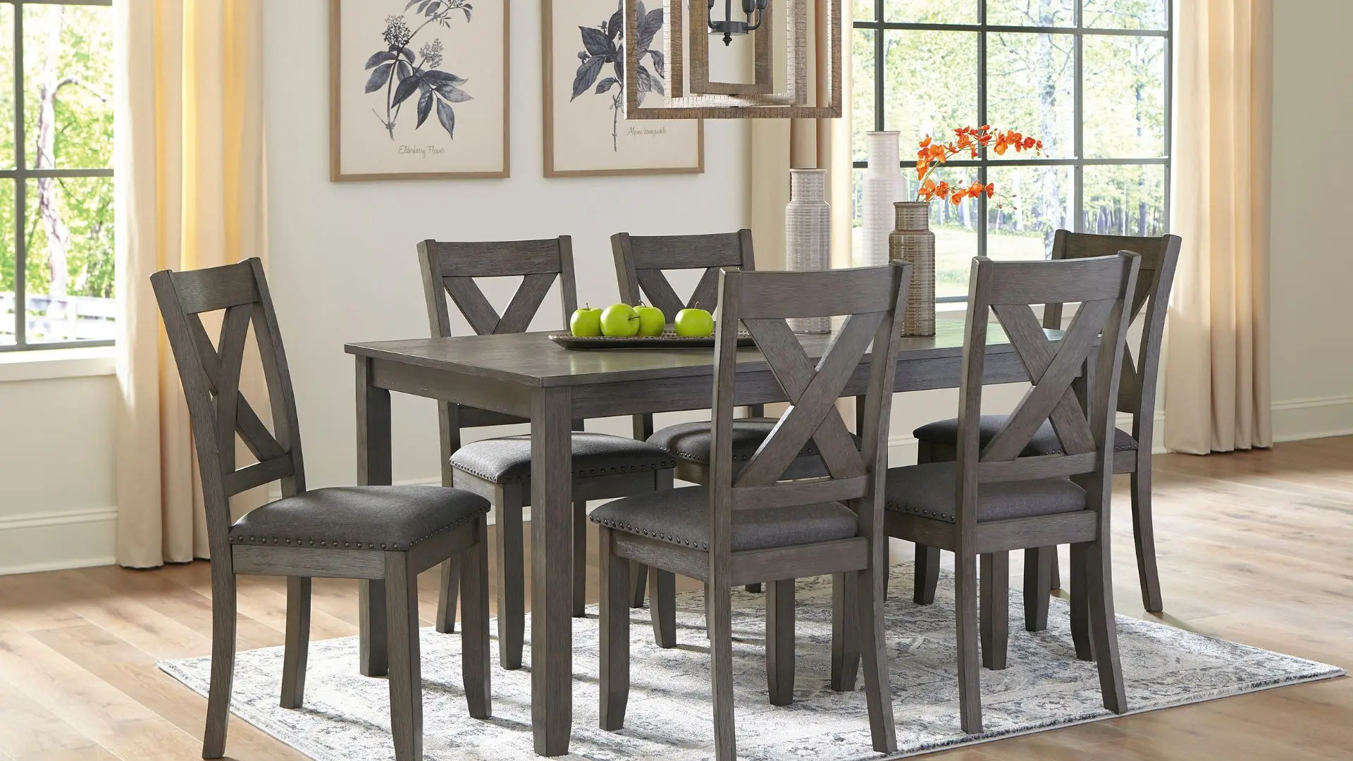 The Caitbrook counter height dining set makes a chic statement with its clean, contemporary design. Finished in a subtle gray wash, it radiates casual sophistication, while the soft, neutral upholstery of the cushioned seats ensures comfort for hours. Whether it’s family dinners, casual get-togethers, or lively game nights, this set blends style and function beautifully.