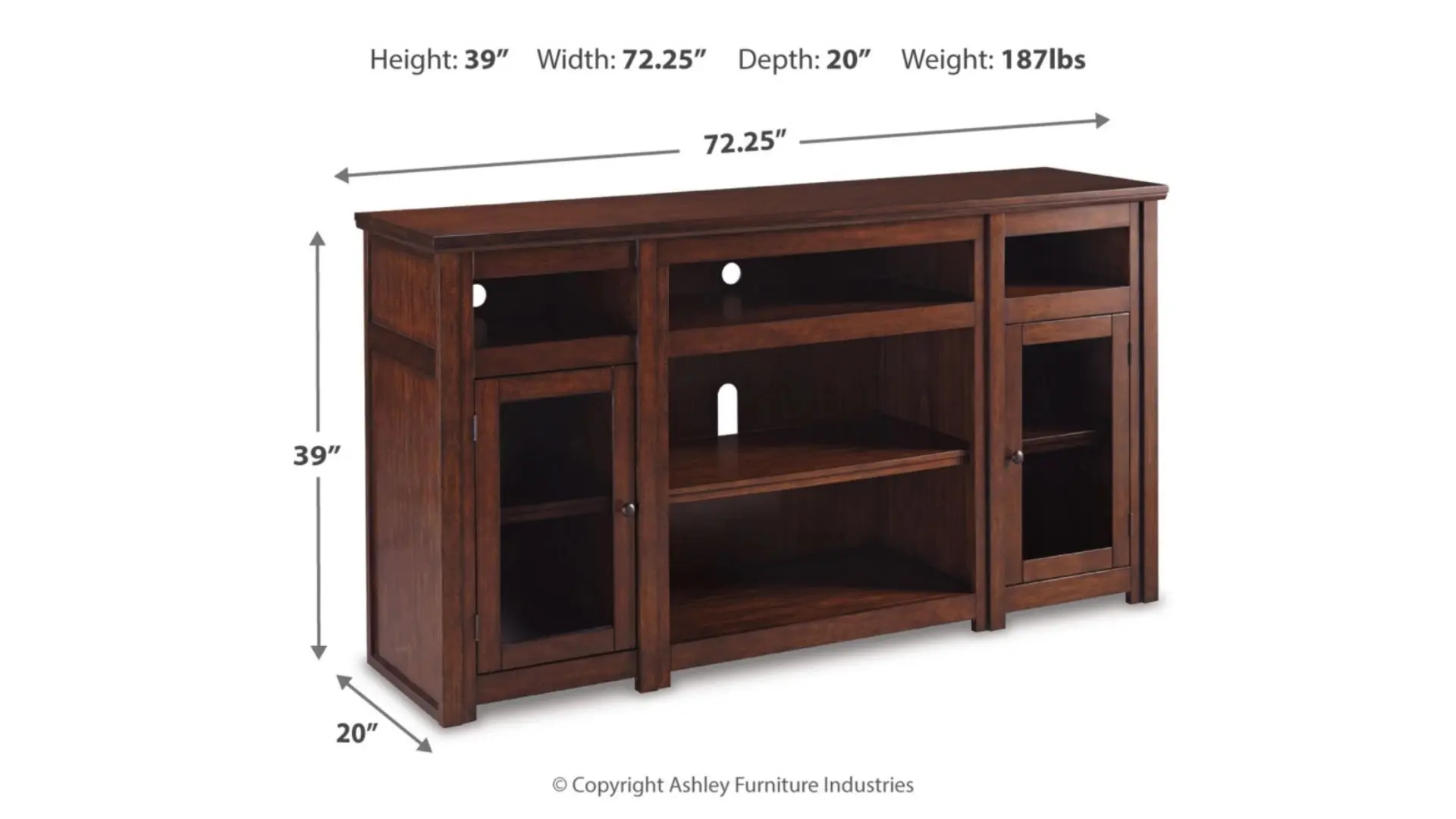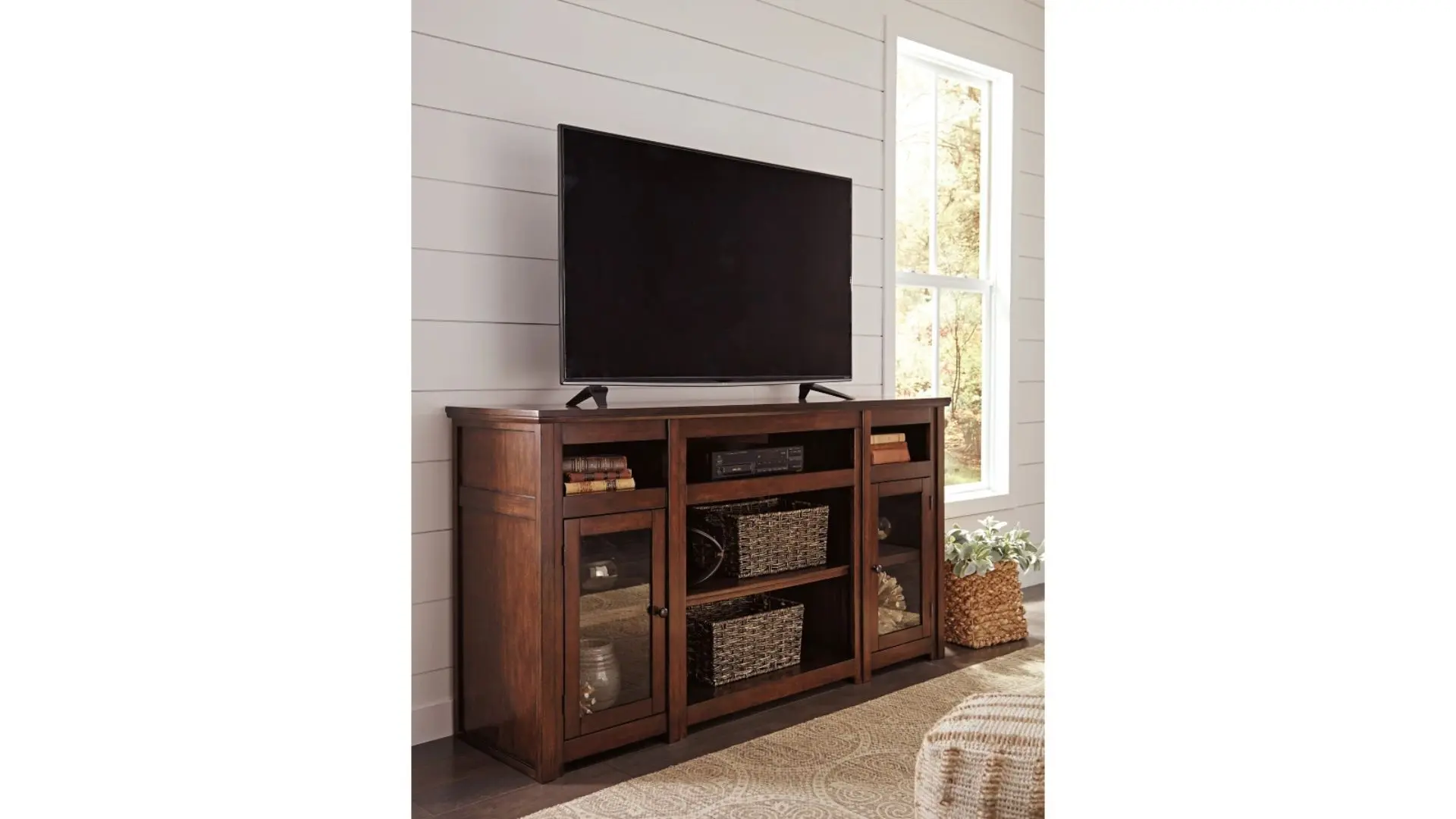 Enhance your entertainment space with this beautifully crafted TV stand, designed for both style and functionality. Its sturdy construction provides a robust feel, while the recessed top shelf is perfect for a sound bar or other media devices. The adjustable center shelf offers flexible storage options, and two side cabinets with framed glass doors provide additional space to keep your essentials neatly organized. Built-in cutouts allow for easy cable management, keeping your setup clean and clutter-free.