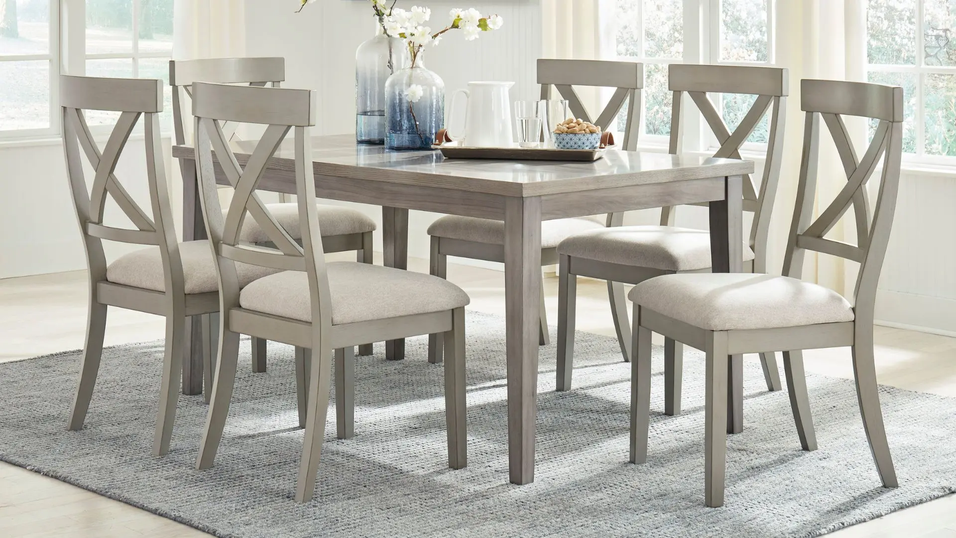 Bring a relaxed yet refined sense of good taste to a space with the casually cool Parellen dining set. Clean-lined frame sports a gray finish that’s so easy on the eyes. Topped by a durable melamine surface, the table’s an easy-living alternative to traditional wood tables. And with the look of reclaimed barn wood, this set is an inspired choice for modern farmhouse living.